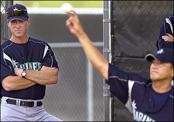 El nuevo mánager de los Marineros Bob Melvin, supervisa al relevista Kasuhiro Sasaki