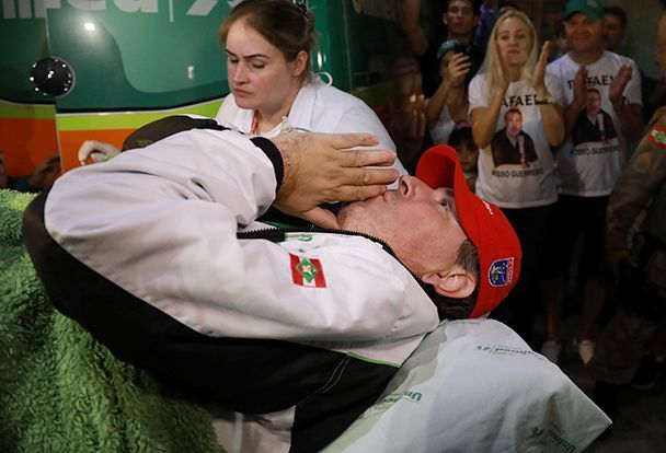 Se colocan medallas de ganadores en los cuellos de viudas e hijos. Muchas de las esposas visten las camisetas de sus maridos al revés, de manera que sus nombres están al frente. Desde su silla, Follmann levanta el trofeo mientras llora. Cuando Bárbara, la esposa de Ananias, recibe su medalla, ella grita repentinamente y levanta sus manos apuntando al cielo con dos dedos.