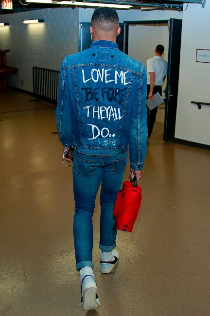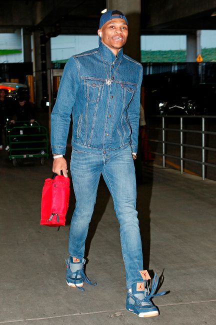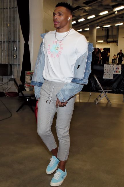 “Russ canalizando su Jesus Shuttlesworth interior de 'He Got Game' con el mono de mezclilla oscuro. Y nunca puedes equivocarte con las camisetas bajas blancas #NoSocks”