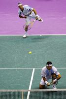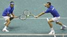 Los franceses Arnaud Clement y Michael Llodra van en busca de la pelota durante el choque de dobles frente a Argentina
