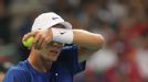 El checo Tomas Berdych se seca la transpiración antes de servir durante el segundo partido de la serie frente al serbio Janko Tipsarevic