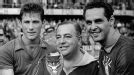 Vicente Feola, DT de Brasil sostiene la copa junto al capitán, Hideraldo Luiz Bellini, y al arquero, Gylmar Dos Santos Neves