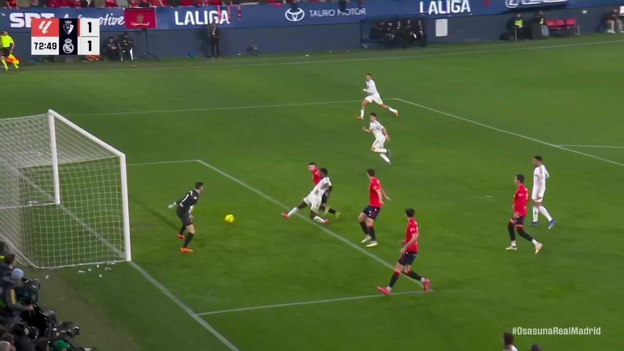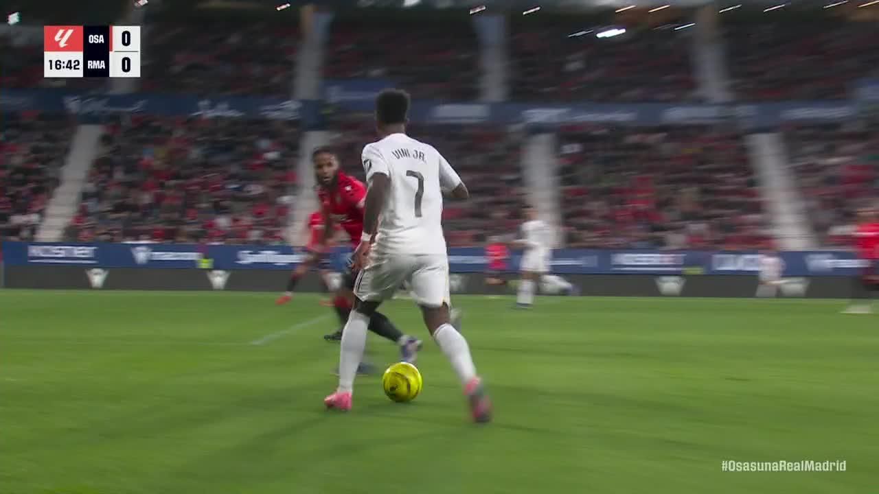 Disparo de Vinícius Júnior desde fuera del área, asistido por Álvaro Carreras, que fue detenido junto al poste derecho.