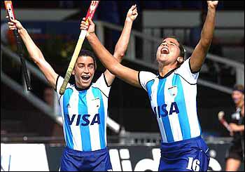 Cecilia Rognoni (derecha) grita su gol contra Nueva Zelanda; con la victoria 3-0 Las Leonas ya estaban en la final