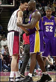 Shaquille O'Neal saluda por primera vez a Yao Ming, momentos antes de dar inicio a su esperado duelo en el Compaq Center de Houston.