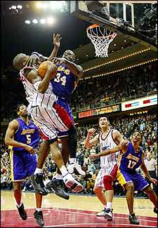Ni Shaq pudo detener a Steve Francis, que se robó el protagonismo del partido colando 44 puntos. Aquí Shaquille le comete una falta personal.