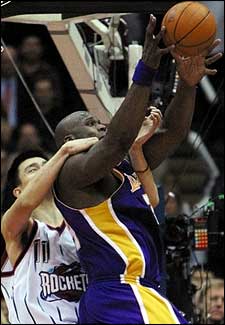 El espigado Yao, de 7 pies 6 pulgadas, le comete falta a Shaq, de 7'2" y 350 libras, en el tiempo extra del partido que ganaron los Rockets a los Lakers, 108-104.