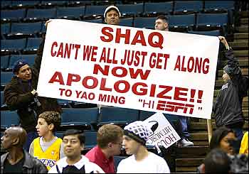 Fanáticos de Houston sostienen una pancarta que dice que Shaq le pida perdón a Yao por los insultos que le hiciera hace unas semanas. El partido, de paso, fue transmitido por todo el mundo por ESPN.