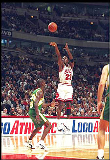 Todos nosotros hemos sido sorprendidos por las genialidades de Jordan, más aún los aficionados de Chicago, que lo consideraban casi un dios.