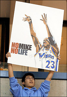Eddy Li, fanático de Michael Jordan, sosteniendo un cartel alusivo al retiro de "Air"