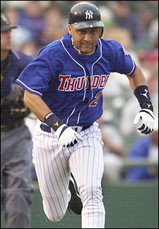 Derek Jeter, con el uniforme de Trenton Thunder, club filial doble A de los Yankees, en el cual hizo su rehabilitación.