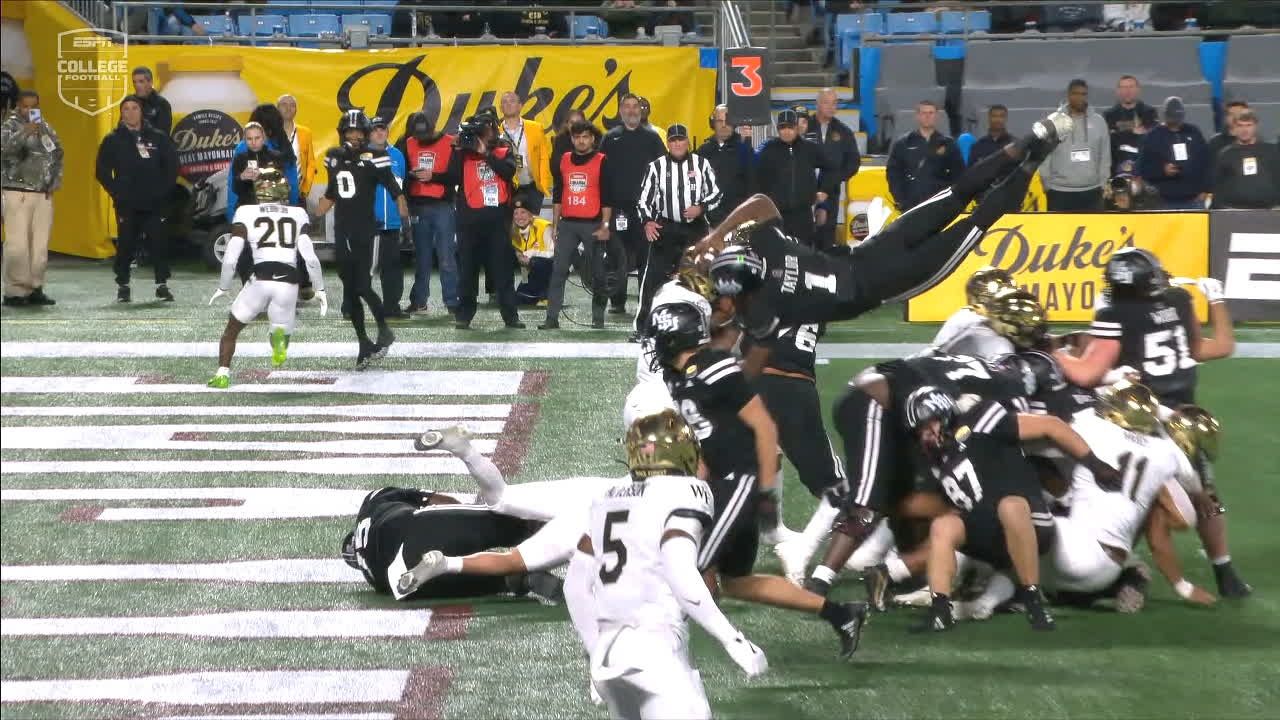 Kamario Taylor salta y logra cruzar el balón a la zona prometida. La jugada fue revisada por los oficiales y se mantiene como touchdown, acercando a Mississippi State en el marcador.