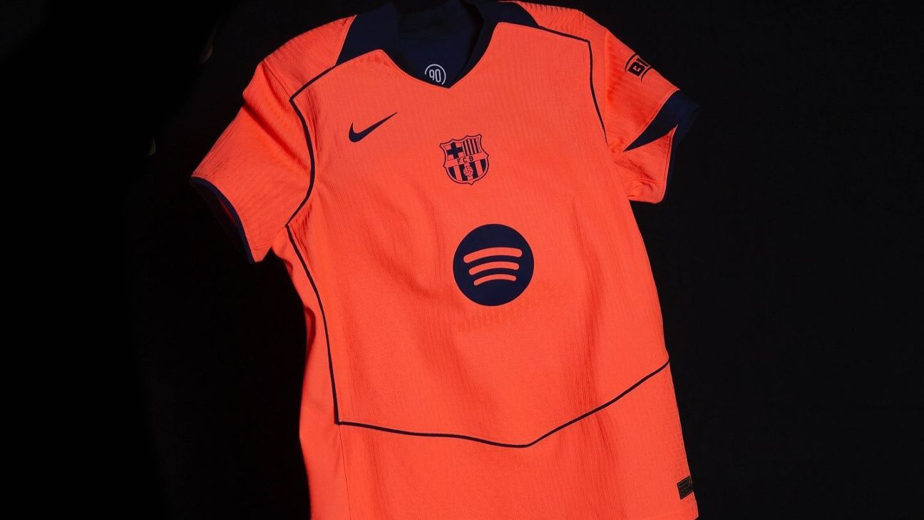 Posiblemente una de las mejores propuestas de «Total 90», la llamativa tercera equipación naranja neón del Barcelona podría pasar por una equipación de entrenamiento de la era postmilenaria, y sin duda queda mejor una vez que se aplican los nombres y números de los jugadores. No estamos del todo seguros de qué es, pero sigue pareciendo que a estas equipaciones retro de Nike les falta algo crucial.