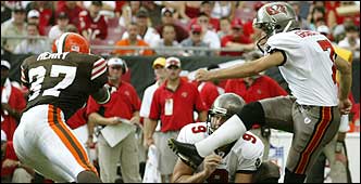 El argentino Martín Gramática, a la derecha, tuvo una mala tarde a pesar de que Tampa Bay venció a Cleveland. Aquí, Anthony Henry le tapa uno de sus cuatro intentos de patada, de los cuales sólo pudo conectar uno
