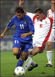 Alessandro Del Piero (izquierda) se escapa a la marca de Tamas Peto; a Italia no le sobró nada, pero le ganó 1-0 a Hungría y clasificó para el Mundial.
