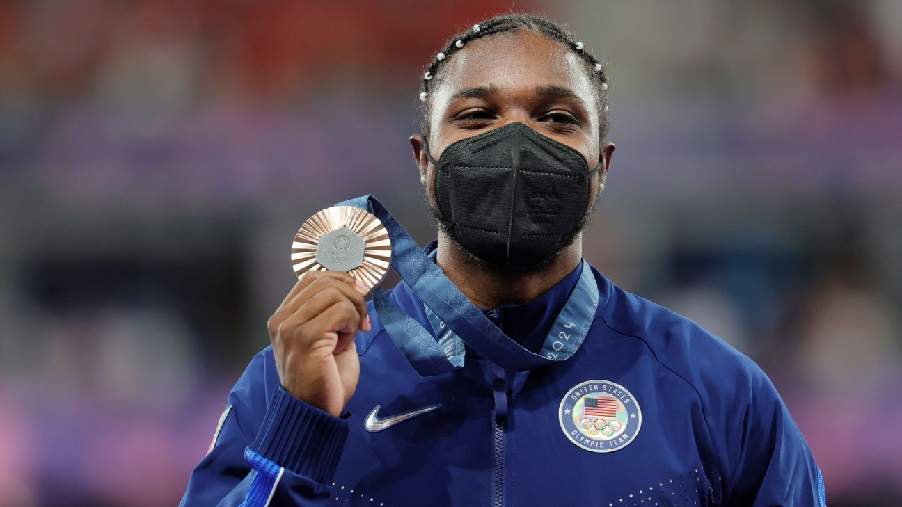 El velocista Noah Lyles usó una máscara anti COVID en la recepción de su medalla de bronce en la prueba de 200 metros