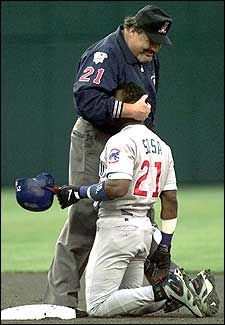 La curiosa escena es de agosto del 97, cuando el umpire se dejó ganar por la simpatía de Sammy y lo abrazó después de sentenciarlo out en su intento de robarse la segunda base ante Cleveland