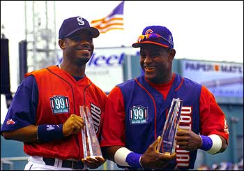 Sammy (derecha) posa para los medios junto con Ken Griffey Jr., los dos más votados al Juego de Estrellas de 1999 por la Liga Nacional y Americana, respectivamente