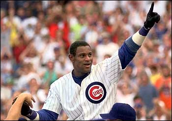Sammy es levantado en hombros por sus compañeros tras pegar su 62° jonrón de la temporada, en septiembre del 98, e igualar a Mark McGwire en la carrera por el récord