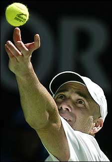 Los ojos fijos en la pelota y la raqueta lista para sacar el mortífero servicio.